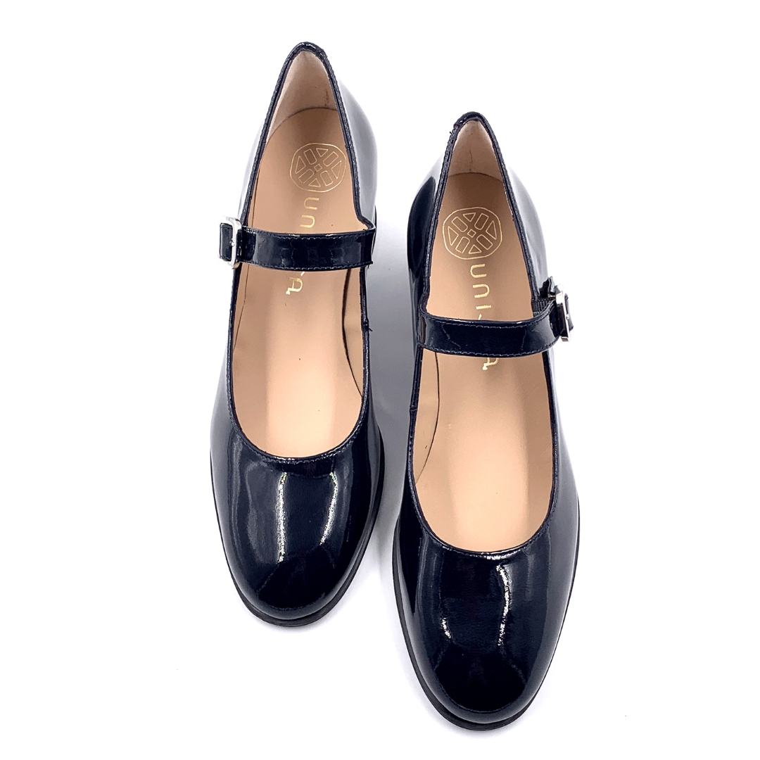 Γόβες Μπλε Mary-Jane UNISA, σε μπλε λουστρίνι δέρμα, σε στρόγγυλη φόρμα, με μπαρέτα. Ντυμένο λουστρίνι 5εκ τακούνι. Ελαφριά, εύκαμπτη και αντιολισθητική σόλα.