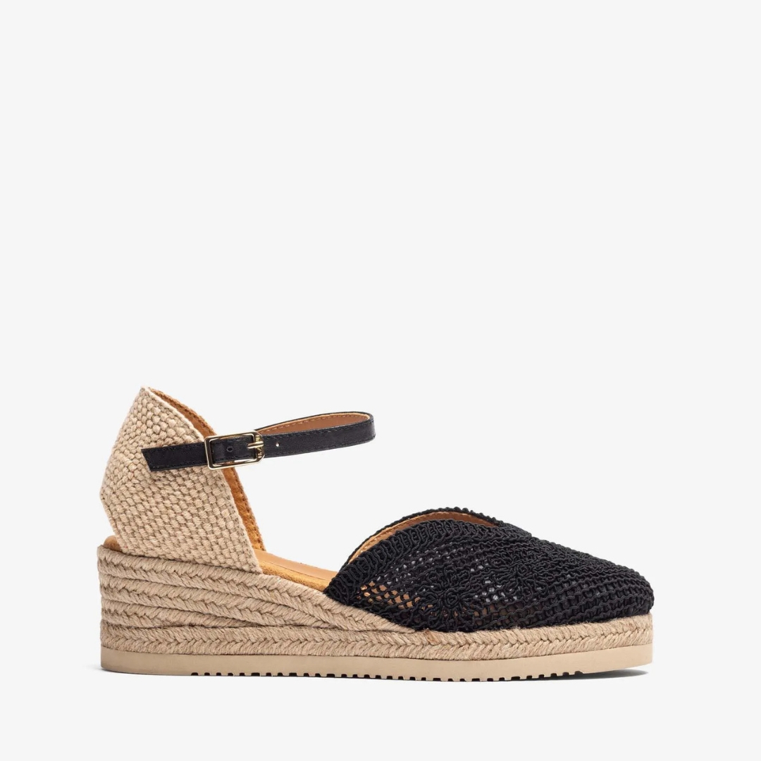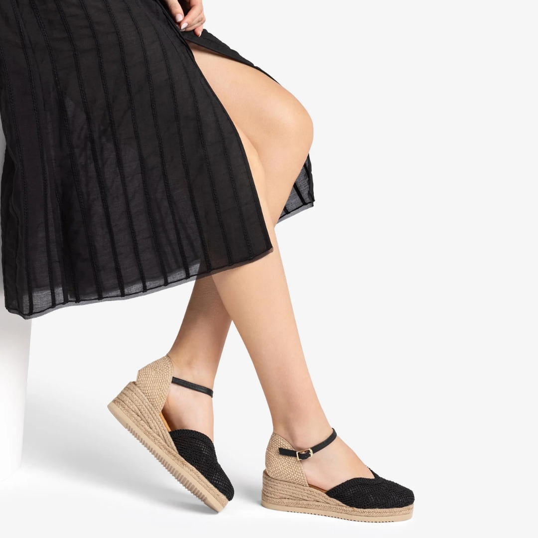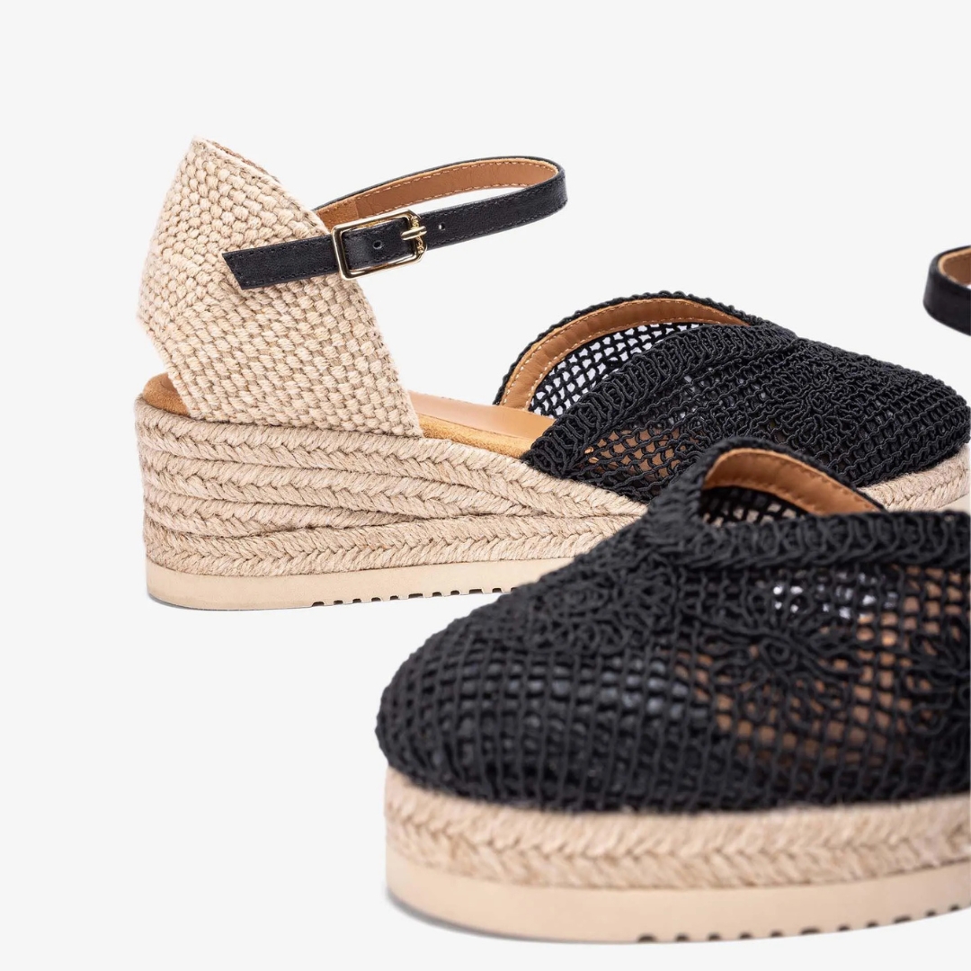 Round toe espadrille made in embroidered fabric. Raffia heel counter and a strap that can be adjusted using the metal buckle. Very light and flexible EVA sole. A design with personality, perfect to add a touch of glamour to your outfits.