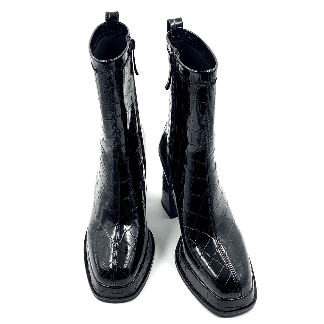 Μποτάκια Plateau NOA HARMON σε μαύρο κροκό λουστρίνι pvc, με δερμάτινο πάτο εσωτερικά. Φερμουάρ στο πλάι και 9εκ χοντρό τακούνι.