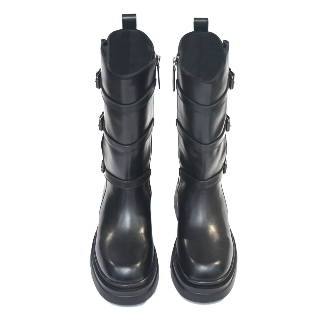 Ankle Boots EMANUELLE VEE , δερμάτινες μαύρες, με φερμουάρ και διακοσμητικά λουριά. Φθάνουν στη μέση της γάμπας και έχουν chunky σόλα.