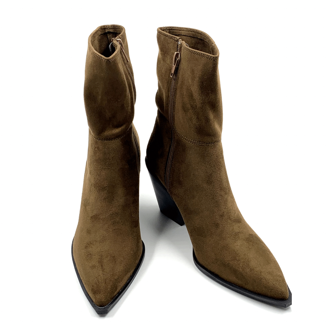 Cowboy Μποτάκια CORINA, σε καφέ alcantara, με φερμουάρ και χαλαρά στην γάμπα. Ύψος τακουνιού 6εκ.