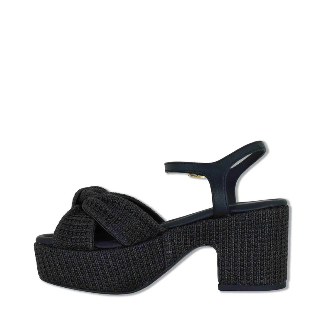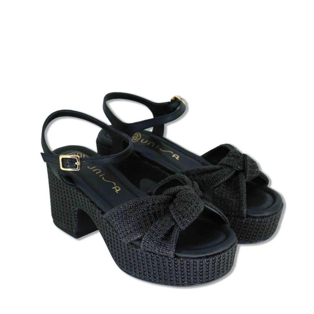 Square toe sandal made in natural raffia. Wide straps with a knot on the front that can adjusted with the metal buckle. Block covered with a matching tone of raffia that is 4cm high on the front and 7cm at the back. Extra padding in the entire sole for your comfort. Light, non-slip rubber sole. With its practical design it can be combined with casual and more formal looks.Material: Leather/Fabric. Color:Black