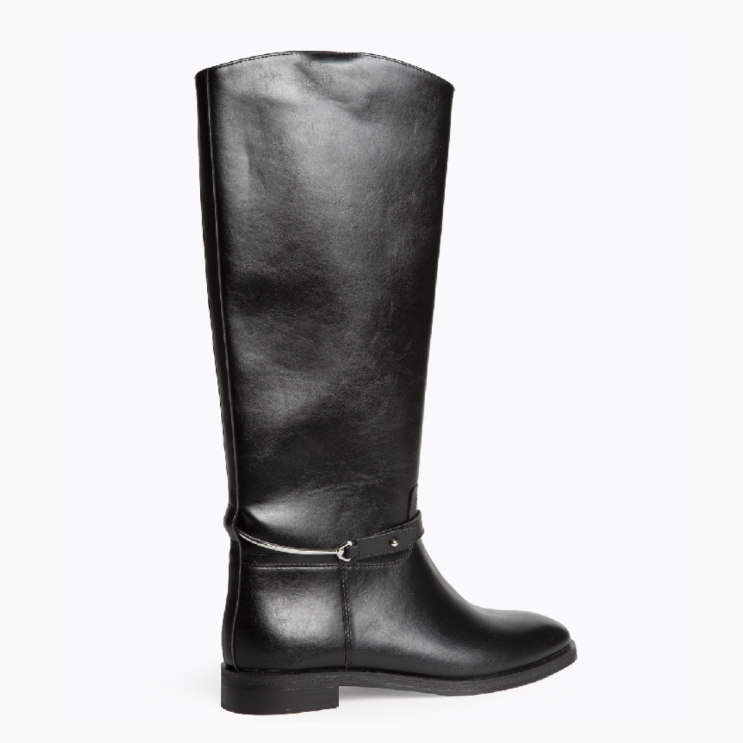 Riding Μπότες CORINA, μαύρες knee-high, σε alcantara, με χαμηλό block τακούνι. Διακοσμημένες με metal horsebit trim, που εύκολα αφαιρείται.